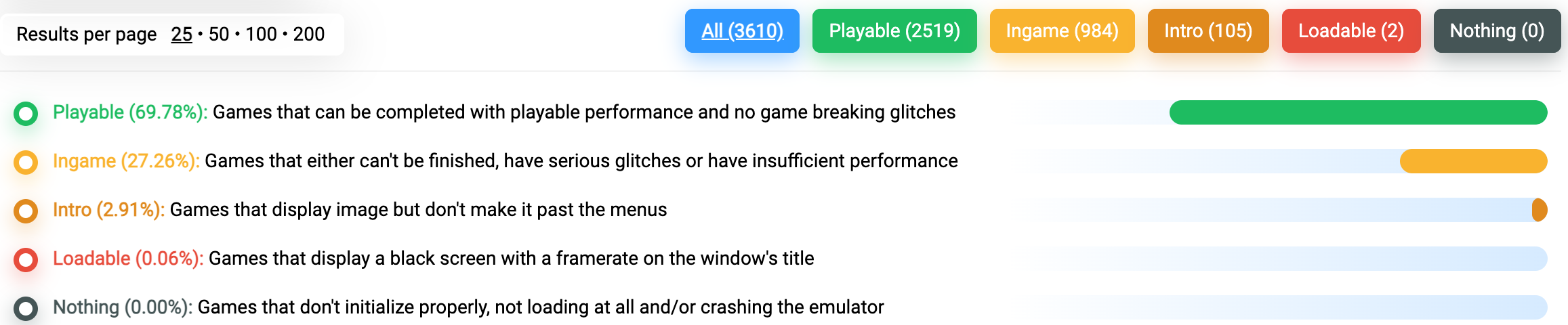 Précisons que 100% des jeux sont exécutables à présent, même s’ils ont encore des bugs ou que certains crash, tous peuvent être lancé, c’est une belle prouesse qu’il faut souligner !
