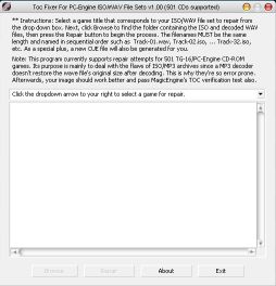 Cette petite merveille a la capacité de réparer la TOC d’un jeu PC-Engine au format iso/wav en restaurant la taille originale de tous ses fichiers. Pour cela, TocFixer utilise une base de donnée interne qui n’est autre que le reflêt du contenu des pages consultables ici même. En plus de redimensionner proprement vos fichiers iso/wav, TocFixer a également la capacité de générer un fichier cuesheet standard pour votre jeu une fois la réparation effectuée.