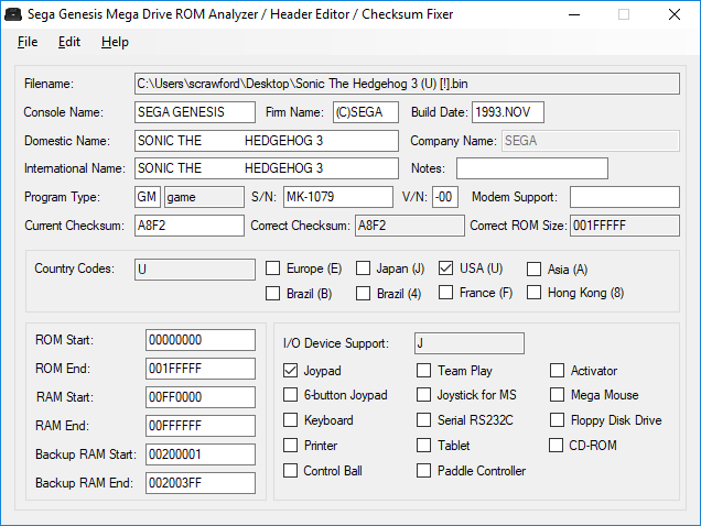 Sega Genesis / Mega Drive ROM Analyzer / Header Editor / Checksum Fixer est un utilitaire Windows permettant d’analyser et modifier les en-têtes (headers) des ROMs Sega Genesis / Mega Drive.